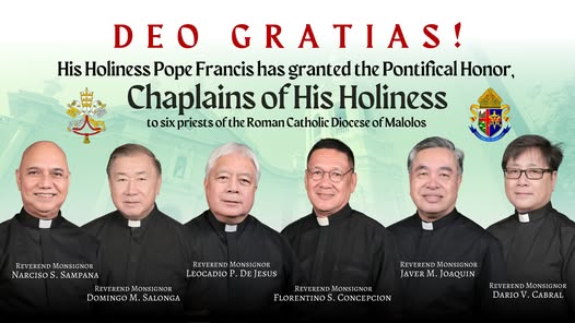 Pope Francis has honored six priests of the Diocese of Malolos for their “invaluable service and dedication” to the Catholic Church.